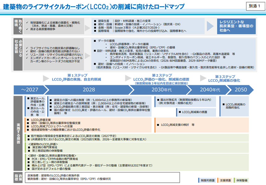 2025年には「建築物のライフサイクルカーボンの算定・評価等を促進する制度に関する検討会」が設置され、2028年の制度化を目指し段階的な導入案が議論されました。具体的には、大規模建築物を対象としたLCCO₂の評価・届出を求める規制的措置や、評価結果の第三者認証や表示制度の創設といった誘導的措置が検討されています。また、CO₂原単位の整備に向け、窓・サッシ、石膏ボードや断熱材を対象に、建材EPD検討会議も設置されています。建築分野の脱炭素化への対応は現在の「任意の取組」から将来的には「求められる前提条件」へと移行していくことが想定されています。