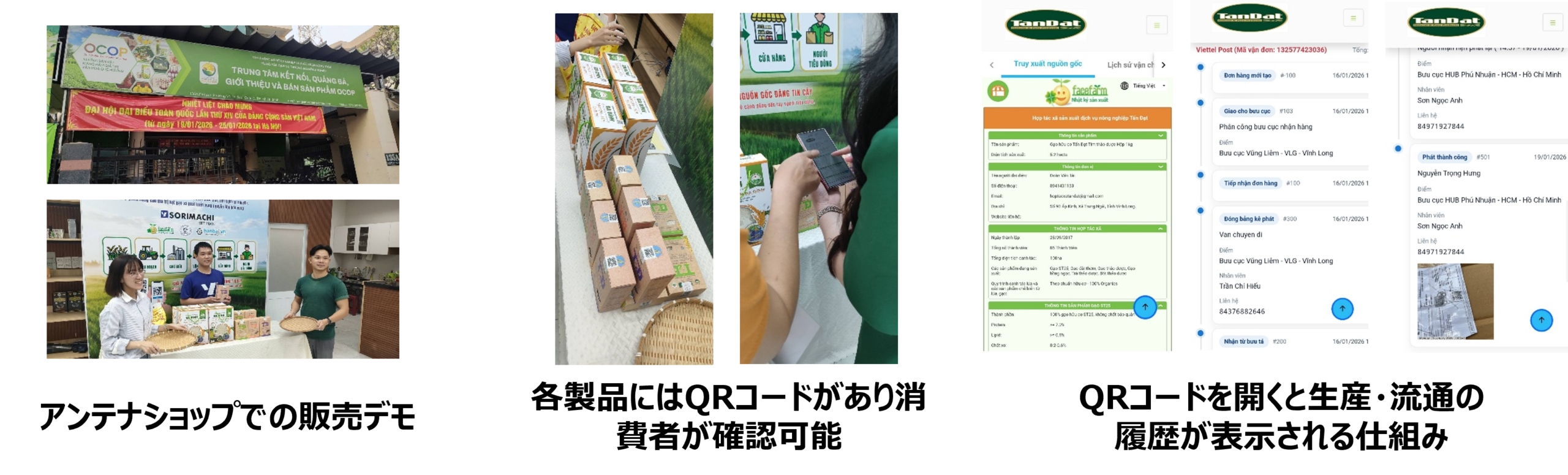 メコンデルタ地域へ新たに展開を進めた販売管理クラウドソフトがユーザーを獲得するとともに、持続可能な調達へ向けた小売事業者との連携のための取組を整理しました。加えて、ホーチミン市におけるアンテナショップでの販売実証では、QRコードを利用して消費者が生産情報にアクセスできる仕組みを実証しました。こうした情報の消費者コミュニケーションはトレーサビリティを確保し、安心安全で高品質な農産物であることを示すことができるため、農産物の高付加価値化に必須です。また、販売実証に参加した農協からは、流通事業者へのデータ提供が自動化されたことにより在庫管理が効率的となったとの声がある等、バリューチェーンを通じたベトナム農業の生産性向上に寄与しております。 今後は農産物認証の取得支援やベトナム全国への展開、ビッグデータの利活用などを見据え、ベトナム農業の更なるDX・GX化へ向けて進めて取り組んで参ります。